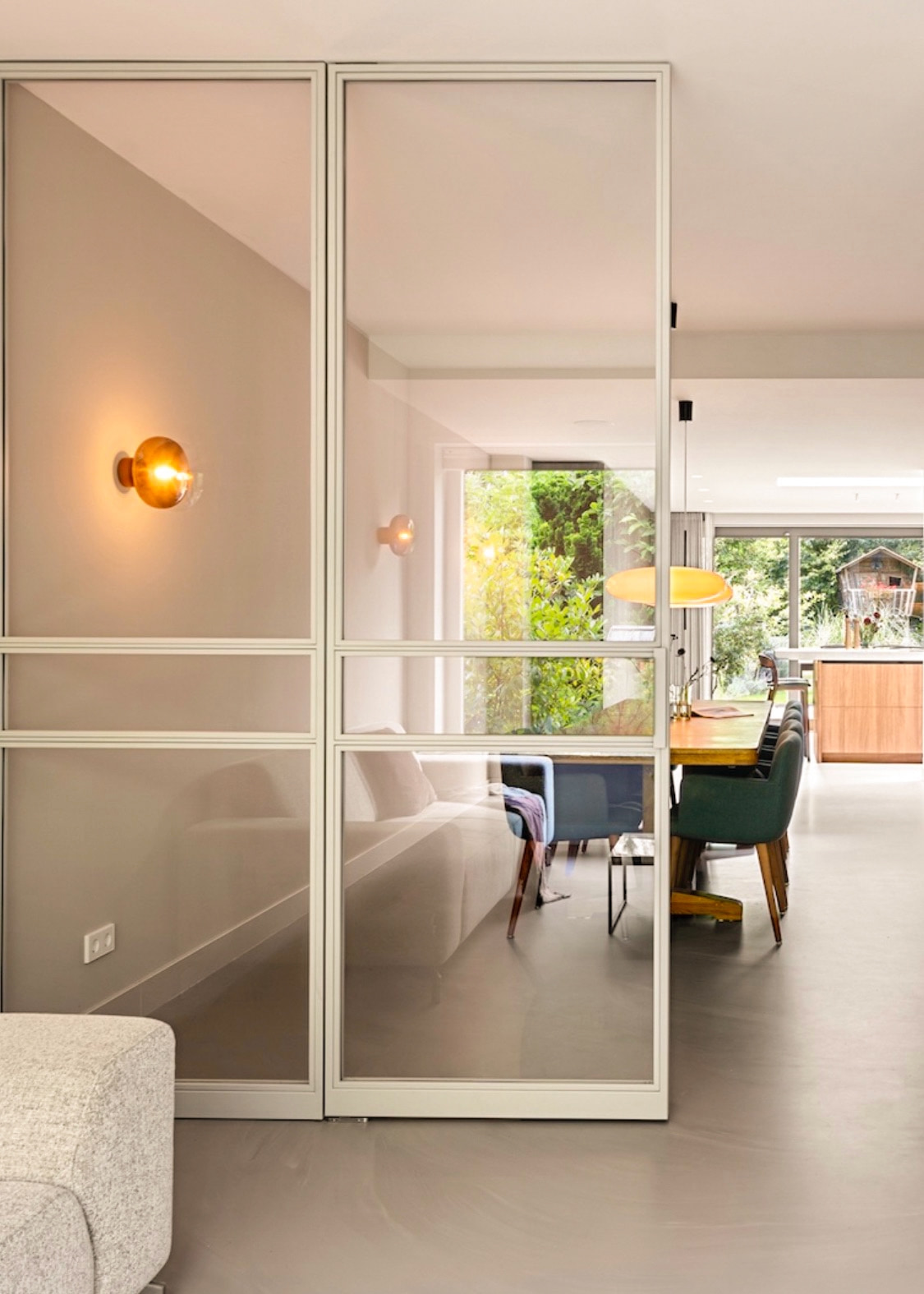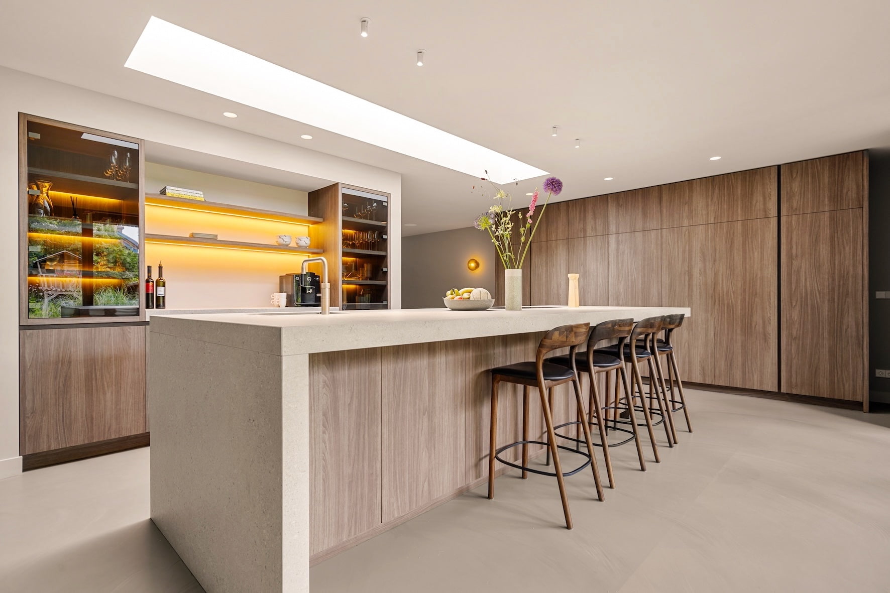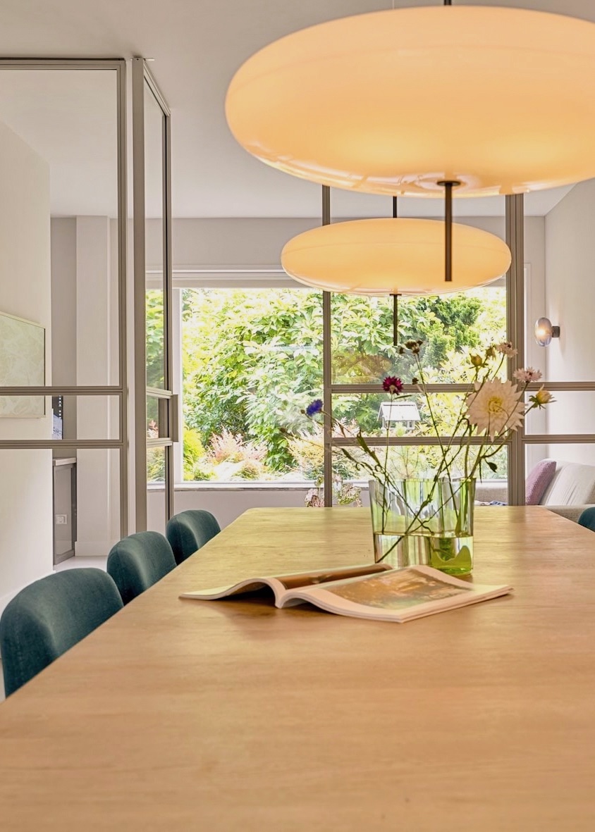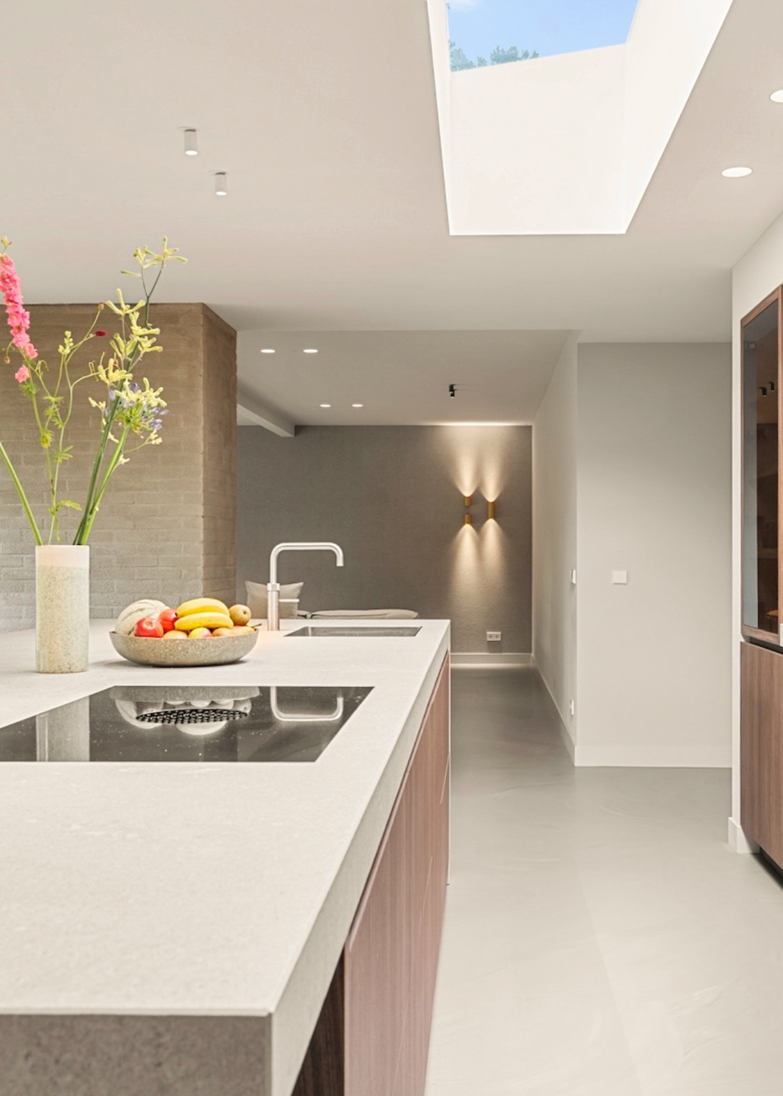 Een mooie samenwerking met House of Architects, aannemer VandenBrandhof, Maarten maatwerk en Hero interieurontwerp. En grondige verbouwing waarbij het binnenzwembad omgetoverd werd tot woonruimte en studio en er in de gehele woonetage eenheid gecreëerd is. Er is gewerkt met prachtige natuurlijke materialen. De bewoners wilden graag een lichte, rustige basis die ook warmte uitstraalt. Een luxe penthouse als inspiratiebron en de keuken als stijlvol middelpunt. Door mij ontworpen en op maat gemaakt door de meubelmaker. Van hetzelfde materiaal lieten we ook een prachtig thuiskantoor maken. De grote gebaren tonen de gastvrijheid van de bewoners die hun huis graag met vrienden en familie delen, maar vooral zelf heerlijk genieten van het eindresultaat. ’Make it simple but significant’